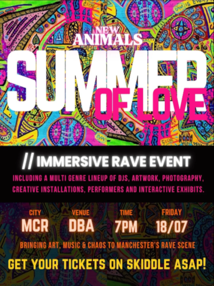 A high-energy celebration of Manchester’s creative spirit, brought to life by New Animals through their signature blend of multi-genre music, art, and joyful chaos. Drawing on the rebellious legacy of past Summer of Love movements, the event channels the power of collective expression and resistance and that history doesn't repeat, but it does rhyme. Reminding us that in hard times, people always find a way to come together.