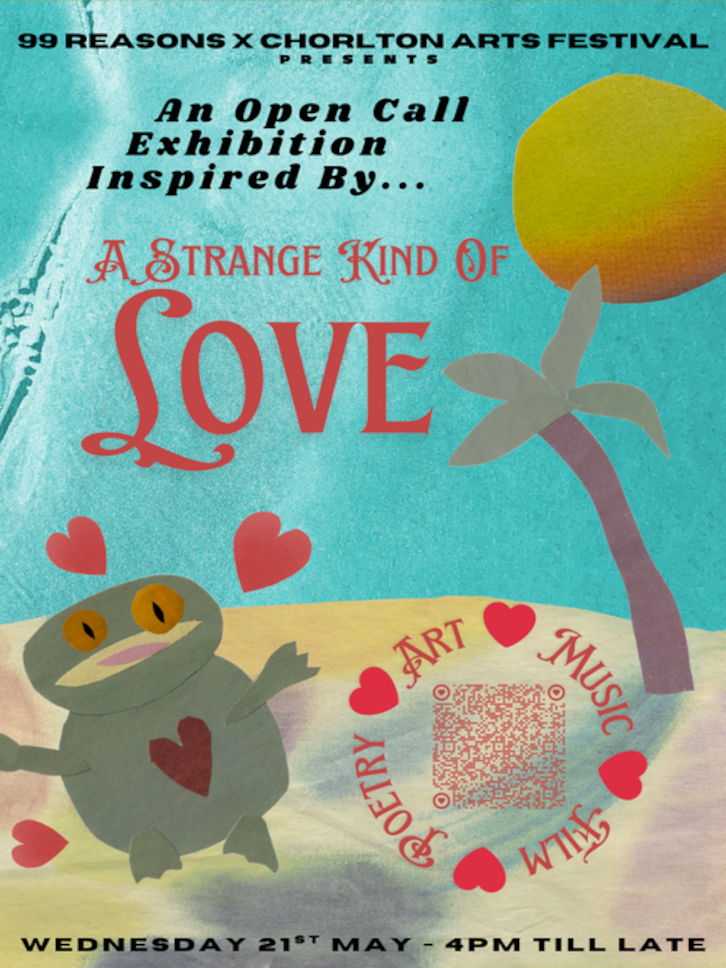 A bold, multi-arts event presented by 99 Reasons and Chorlton Arts Festival. It invites artists and non-artists alike to explore unusual, unexpected, and unconventional forms of love through a mix of visual art, music, film, and live poetry performance.
